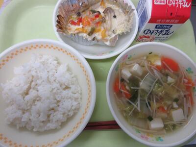 今日の給食は、麦ごはん、牛乳、魚のチーズ焼き、五目豆腐汁でした。