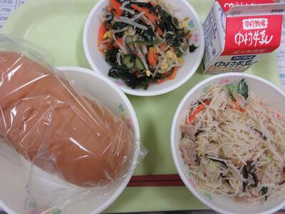 金曜日の給食は、コッペパン、牛乳、炒めビーフン、中華風わかめサラダでした。