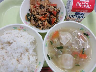 今日の給食は、麦ごはん、牛乳、ビビンバ、ぎょうざスープでした。