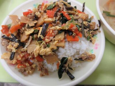 今日は、韓国でよく食べられている料理のビビンバでした。子どもたちは、おいしそうにほおばっていました。