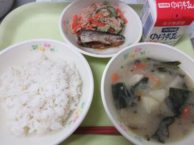 今日の給食は、麦ごはん、牛乳、いわしの梅煮、豚汁でした。