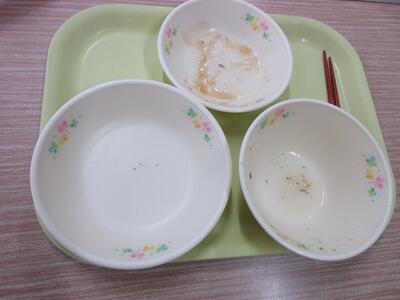 村所小学校の子どもたちは、いつもとてもきれいに食べてくれます。ぴかぴかのお皿の写真も紹介します。感謝の気持ち・食事のマナーも毎日100点満点です。