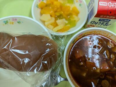 今日の給食は、黒糖パン、牛乳、チリコンカン、フルーツ和えでした。