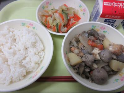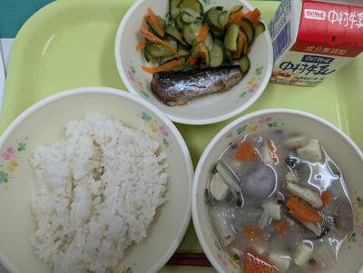 今日の給食は、麦ごはん、牛乳、いわしの生姜煮、切干大根の酢の物、なめこ汁でした。