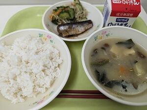 今日の給食は、麦ごはん、牛乳、いわしの生姜煮、切干大根の酢の物、なめこ汁でした。