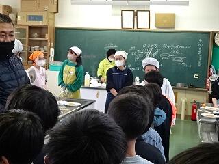 次に栄養士の先生から給食のできるまでを、実際の写真を交えて紹介してくださりました。細かいところまで気を使いながら、大量の材料を大きな鍋で煮こむ様子に子どもたちも驚きの様子でした。