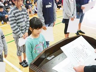 まず、児童代表児童が、登下校中の安全見守りに対してお礼の言葉を述べました。