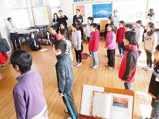 代表児童の指揮、伴奏で、久しぶりの校歌斉唱です。