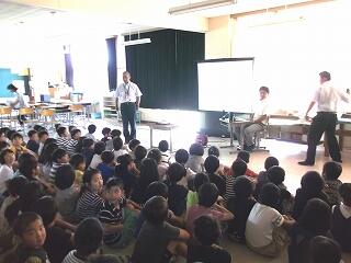 9月14日(金)の朝の時間に木城中学校の生徒さんが見えて、『健康集会』が行われました。プロジェクターを使いながら「熱中症の予防」について中学生が発表してくれました。クイズを交えたり、写真やグラフを使ってとてもわかりやすい発表で、木城っ子たちも熱心に聞き入っていました。さすが中学生!と感心しました。
