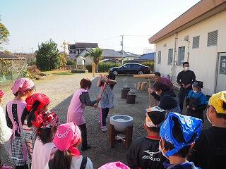 みんなで構えました。掛け声は「モグラうちゃ、すっとんとん」「となりの雪隠(トイレ)は、ほっくりかえせ(掘り繰り返せ)」