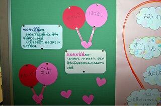 保健室横の掲示板には、保健委員会児童の作成した人権に関する掲示物が掲示されています。今回は「言われてうれしい ふわふわことば」、心の健康への啓発です。心と体は一体と言われます。心の健康を大切にすることで、体も健康にしようという気持ちが伝わってきます。