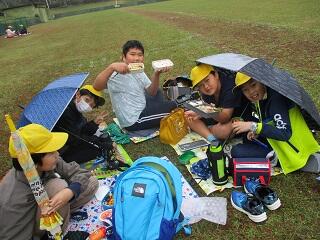 雨が心配でしたが、なんとか曇りのまま天気は保ち、南郷運動公園で美味しくお弁当を食べました。食後には、1・2組一緒にだるまさんが転んだで遊びました。
