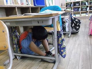 本校でも、参加登録をし、本日午前10時に、写真のように机の下にもぐるような安全行動を実践しました。