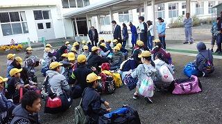 児童代表(大橋君)の心強いあいさつがありました。 出発前最後の担任(平井先生)の注意。ちょっぴり心配そうです。