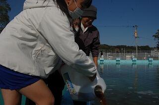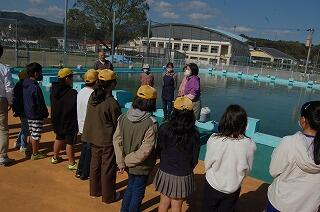 11月11日(水)の昼休みに「木城ほたるをよみがえらせる会(EM菌研究会)」の皆様が来校し、プールに約360リットルのEM菌を、環境委員会の児童と一緒に投入していただきました。