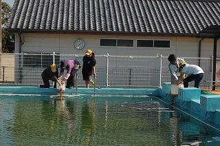 EM菌が入ることで、来年度のプール清掃がとても楽になります。そして、排水後、小丸川に流れ込んだEM菌が河川をよりきれいにしてくれるといいです。