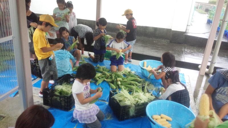 木城小学校では、例年、小学校3年生のみんさなんにトウモロコシの皮むきをしてもらっています。(7:30~ 給食運搬通路)