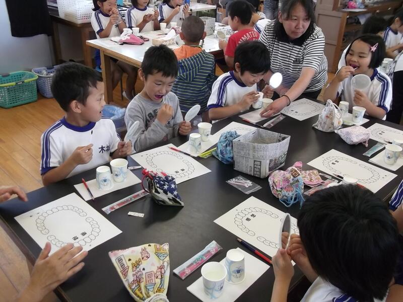 次に、歯磨きの大切さを学ぶために、染め出し体験を行いました。