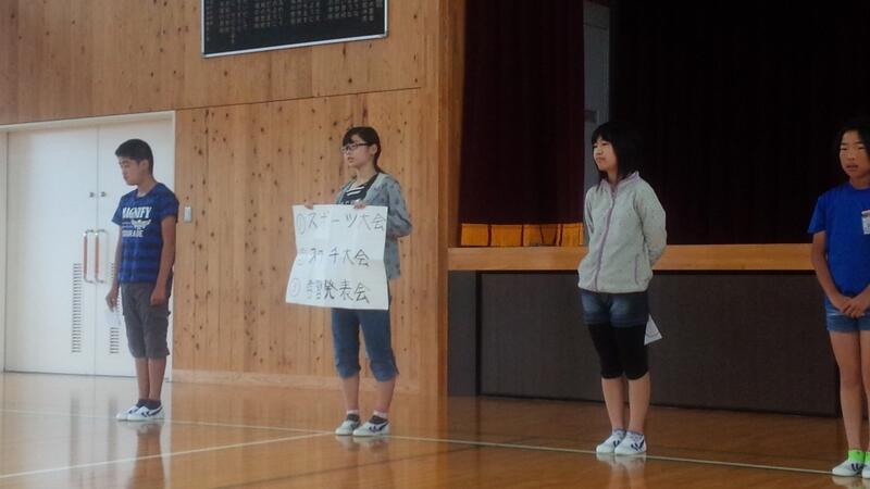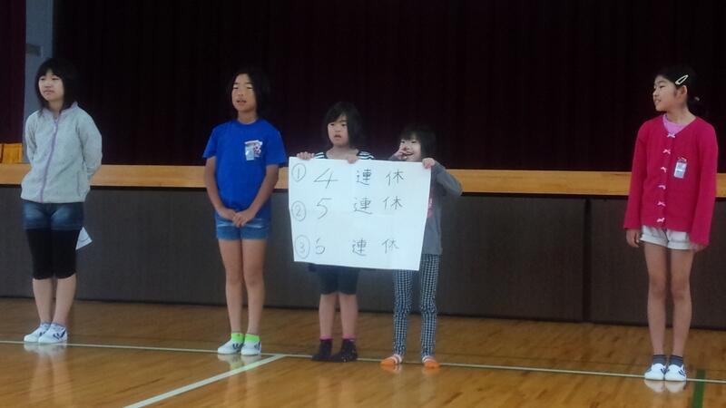 学校の様子や学校行事のクイズを行いました。全校の児童の前での発表は緊張しましたが、がんばりました。