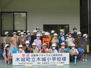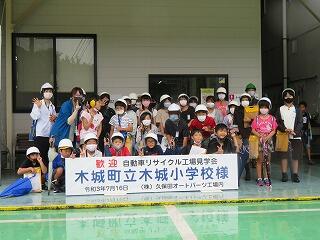 最初の目的地は「久保田オートパーツ」です。子どもたちは初めて見る作業や機械に驚き、真剣に話を聞いたりメモを取ったりしていました。特にエアバッグが出てくるところの見学が印象に残ったようでした。