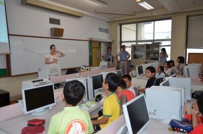 作品を印刷して、気に入った作品を選び、みんなの前で発表しました。 正面玄関前で記念撮影しました。 ハイ チーズ!