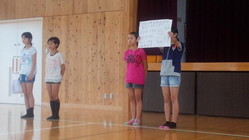 学校の様子や学校行事のクイズを行いました。全校の児童の前での発表は緊張しましたが、がんばりました。