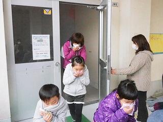 避難の放送に、全校児童が運動場に避難するのに2分30秒でした。毎回徐々に速やかに避難することができるようになっています。