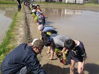 5年生が、田植えを行いました。JA青年部の方々の段取りの良さと、子どもたちの頑張りで、予定よりも広い範囲に苗を手植えすることができました。また、余った苗は、学校に持ち帰り、バケツ稲として育てます。
