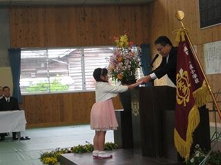次に、通学黄色帽子授与です。町長様より、2組のこたろう君に授与されました。