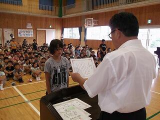次に、児童代表の作文を4年生のかいと君、れいらさんが読みました。1学期の学習を振り返り、楽しみな夏休み、