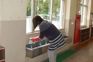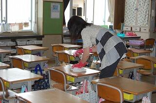 特に、机や椅子、ドアノブ、手すり、水道の蛇口、みんなで使う道具等は入念に行っています。
