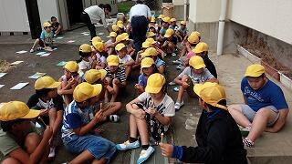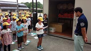 先ず、教室にいる時に地震が発生した時の1次避難です。東児湯消防組合の方々に来ていただき指導していただきました。