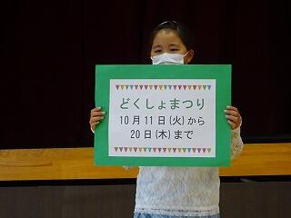 11日朝には 読書集会で、図書委員会のメンバーが読書まつりについの工夫をこらした説明と案内をおこないました