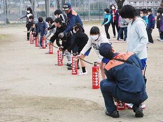 3,4年生は、運動場で水消火器を使った、実際の消火訓練でした。