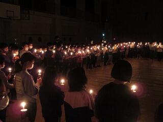 夕食、入浴をすませるとキャンドルファイヤーに時間です。第1部・第3部のおごそかな雰囲気も味わい、第2部では運動会でも披露したエイサーを元気に踊りました。