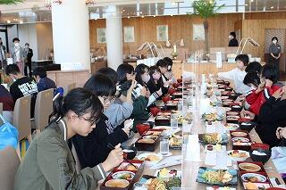 その後、自然の家で最初の食事を楽しみました。バイキング形式の食事に子どもたちもニコニコです。おかわりもして、みんなお腹いっぱいになりました。