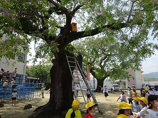 そこで、再び小学校にアオバズクを呼び戻そうと、地域の方々がせんだんの木に巣をかけて下さいました。その巣かけの様子をたくさんの児童・生徒が集まり、興味深く見守りました。子どもたちは地域の方に、写真を見せてもらったり、話を聞いたりして、アオバズクがこの巣にやって来るのがとても楽しみになりました。