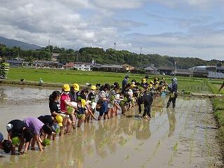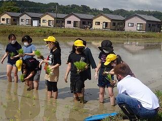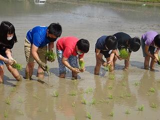JA青年部のみなさんのご指導のもと、みんなで苗を植えていきました。泥に足をとられながらも、楽しく活動しました。青空の下、子どもたちの歓声が響いていました。子どもたちにとって貴重な体験になりました。