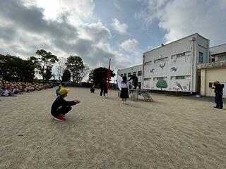 朝の時間に、結団式を行いました。小・中学校1~9年生がそろってのはじめての活動です。