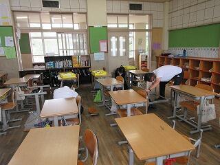 家庭訪問期間中に、学級担任以外の先生方が子ども達の机・椅子の高さ調整を行ってくださいました。子ども達の体格に合った高さにすることで、無理のない姿勢で集中して学習できるようにすることをねらっています。「先生、高さを調整してくださり、ありがとうございました。」とお礼を伝える児童もおり、作業した先生方はとても喜んでいました。