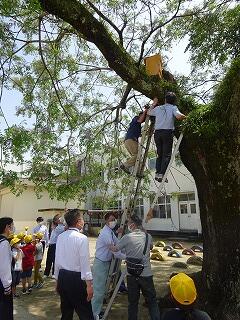 そこで、再び小学校にアオバズクを呼び戻そうと、地域の方々がせんだんの木に巣をかけて下さいました。その巣かけの様子をたくさんの児童・生徒が集まり、興味深く見守りました。子どもたちは地域の方に、写真を見せてもらったり、話を聞いたりして、アオバズクがこの巣にやって来るのがとても楽しみになりました。