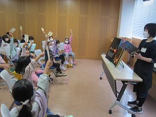 そして待ちに待った読書タイムです。大きな絵本や仕掛け絵本に目をキラキラさせながら本を選んでいました。きまりを守りながらたくさんの本に親しんでいきましょう。