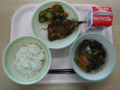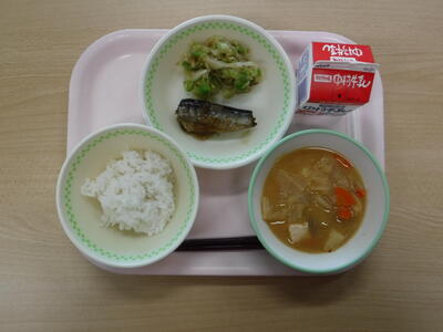 【麦ごはん いわしの生姜煮 野菜のお浸し たまねぎのみそ汁 牛乳】