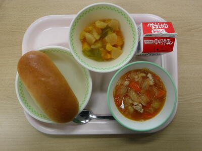 【コッペパン 豚肉とマカロニのトマト煮 とろんフルーツヨーグルト 牛乳】
