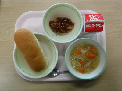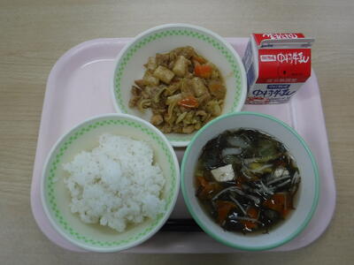 【麦ごはん キャベツと肉団子のスープ煮 大豆と小魚の揚げに 牛乳】