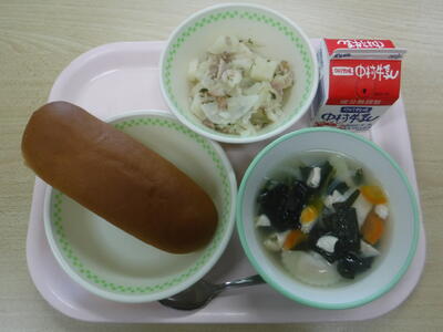 【麦ごはん じゃが豚キムチ 浜うどんサラダ 牛乳】