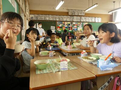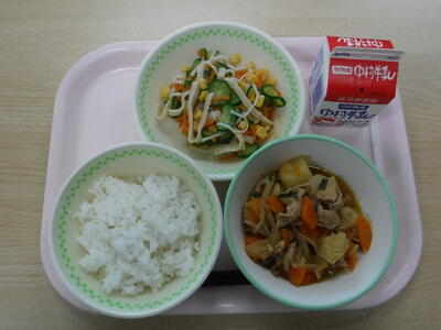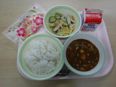 連休明けは、正直ちょっと元気が出ないところですね。今日は、子どもたちが学校に来たくなるようなメニュー、月に1度のカレーです!朝から献立表を見て「やった今日カレーや!」と言っている声が聞こえてきました。給食時間に教室を回ると、「昨日もカレーだった~」という子が今日は多かったような気がします。連休中のごはんはカレーになりがちですよね。カレーの日は本当に驚くほど残菜が少ないです。川南のカレーは、少しスパイシーなのですが、1年生もおいしそうに食べていました。