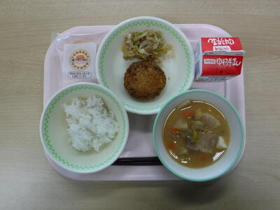 連休明けは、正直ちょっと元気が出ないところですね。今日は、子どもたちが学校に来たくなるようなメニュー、月に1度のカレーです!朝から献立表を見て「やった今日カレーや!」と言っている声が聞こえてきました。給食時間に教室を回ると、「昨日もカレーだった~」という子が今日は多かったような気がします。連休中のごはんはカレーになりがちですよね。カレーの日は本当に驚くほど残菜が少ないです。川南のカレーは、少しスパイシーなのですが、1年生もおいしそうに食べていました。