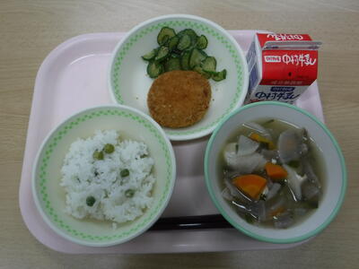 【えんどうまめごはん じゃがいものそぼろ煮 ごま酢和え 牛乳】