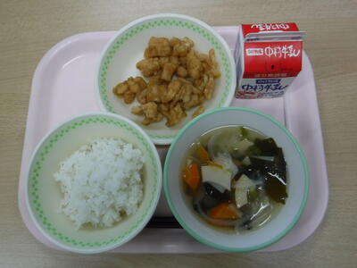 【麦ごはん キャベツと肉団子のスープ煮 大豆と小魚の揚げに 牛乳】